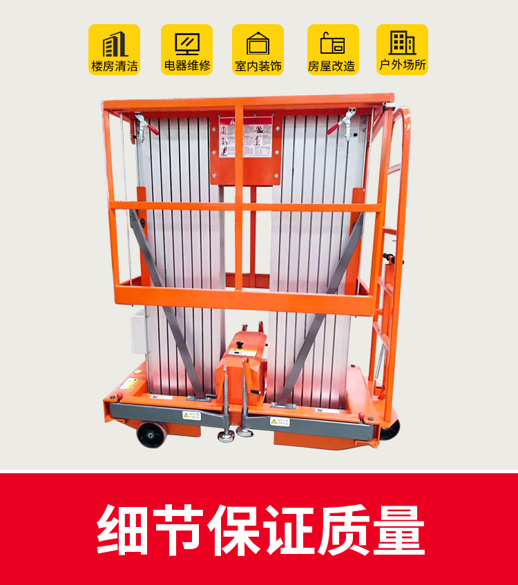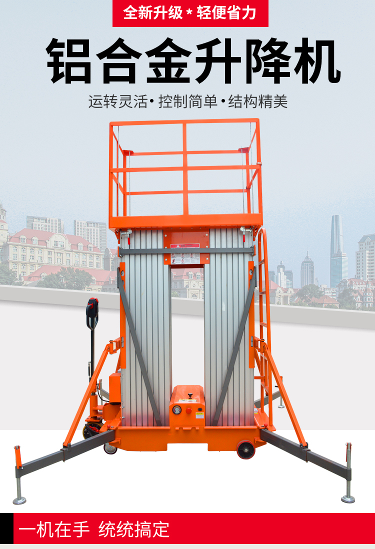 双柱铝合金拼搏(中国)机,具有移动灵活、拼搏(中国)平稳、操作方便、载重量大等特点。采用国外和国产液压泵站。主要适用于工厂、物业单位、商店装潢、建筑、装饰、场馆馆布置、会议中心等行业。